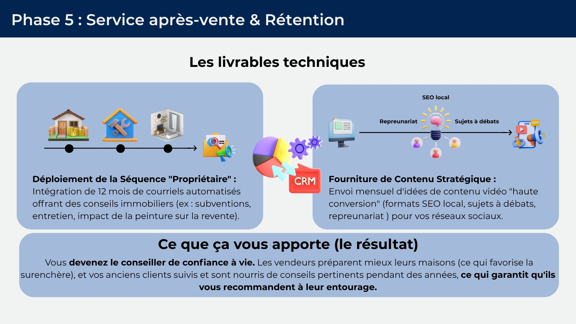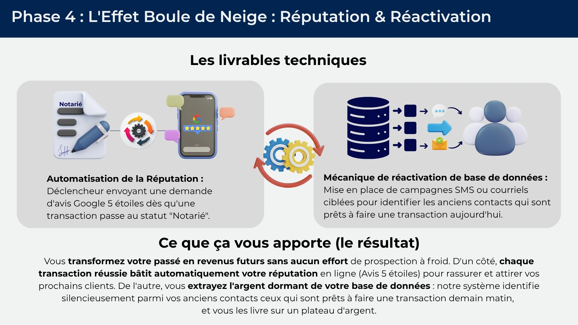 Quand le marché immobilier ralentit, ce système vous permet de naviguer dans les périodes creuses en "pressant le citron" de votre base de données existante. En éduquant et en relançant vos contacts froids automatiquement, vous générez des mandats là où vos concurrents ne voient que du silence.