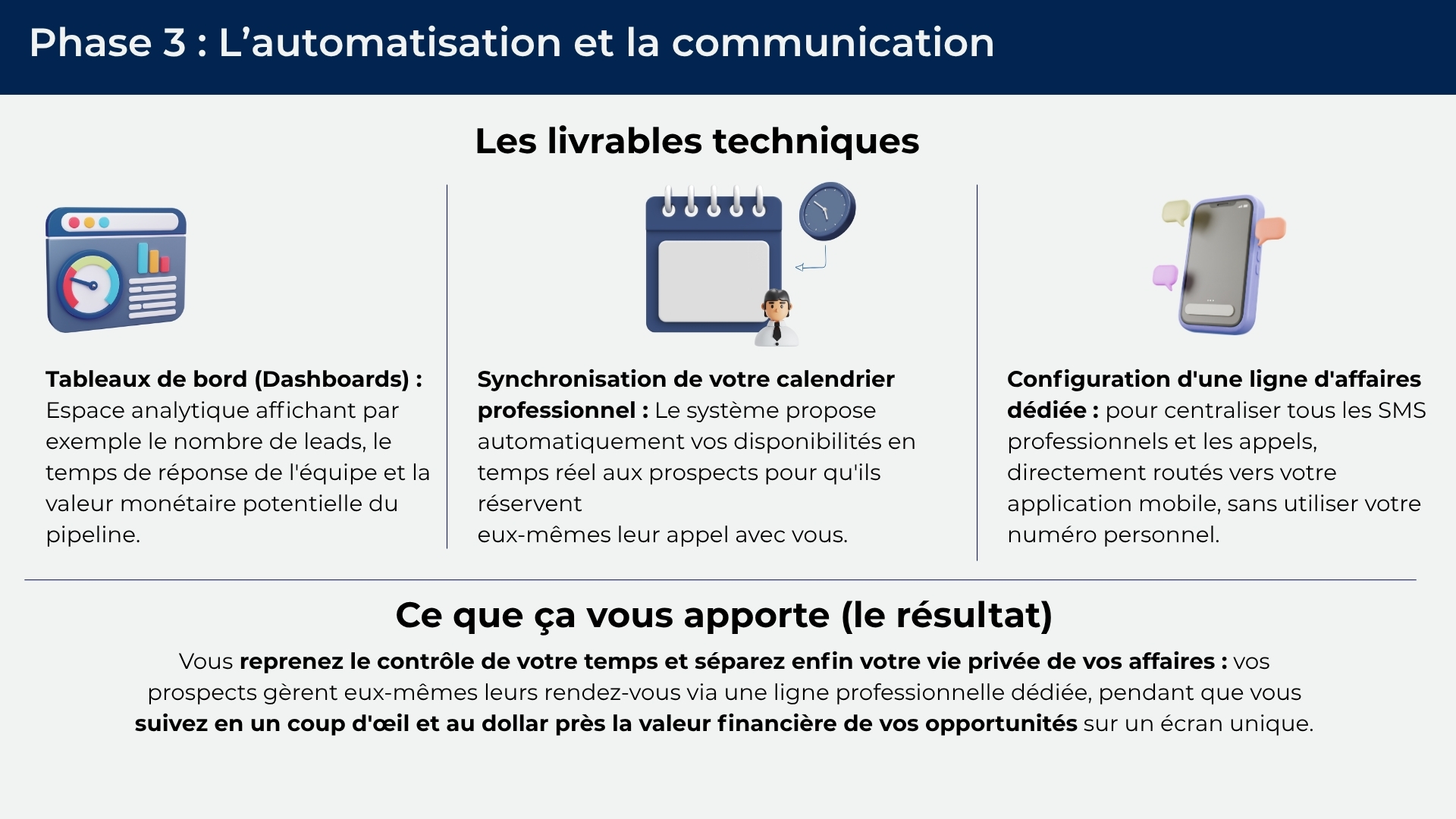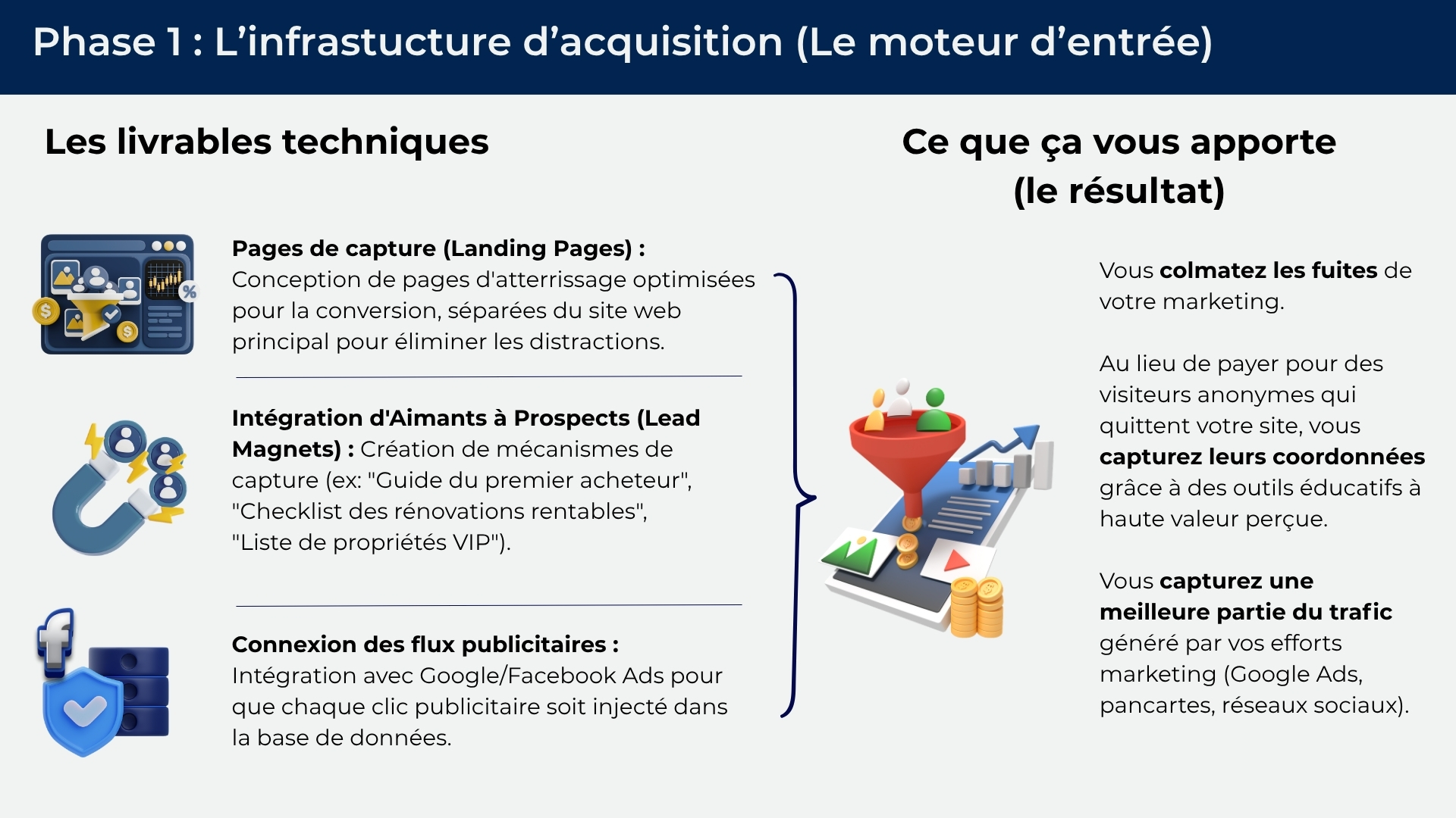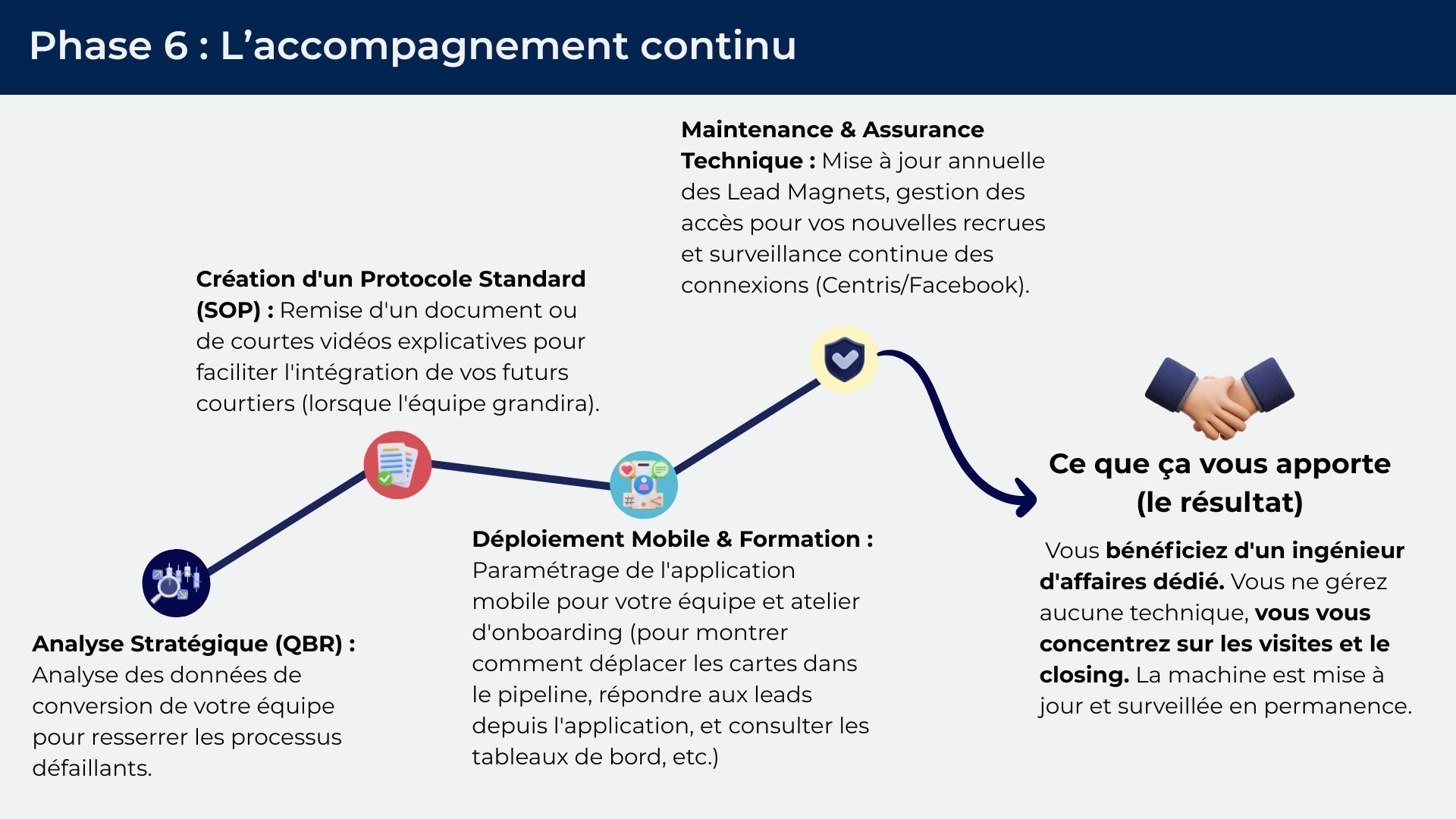 Si vous décidez un jour de revendre votre équipe, votre portefeuille de clients ou votre agence, l'acheteur n'acquiert pas seulement votre réputation : il achètera une machine d'acquisition et de rétention fonctionnelle.