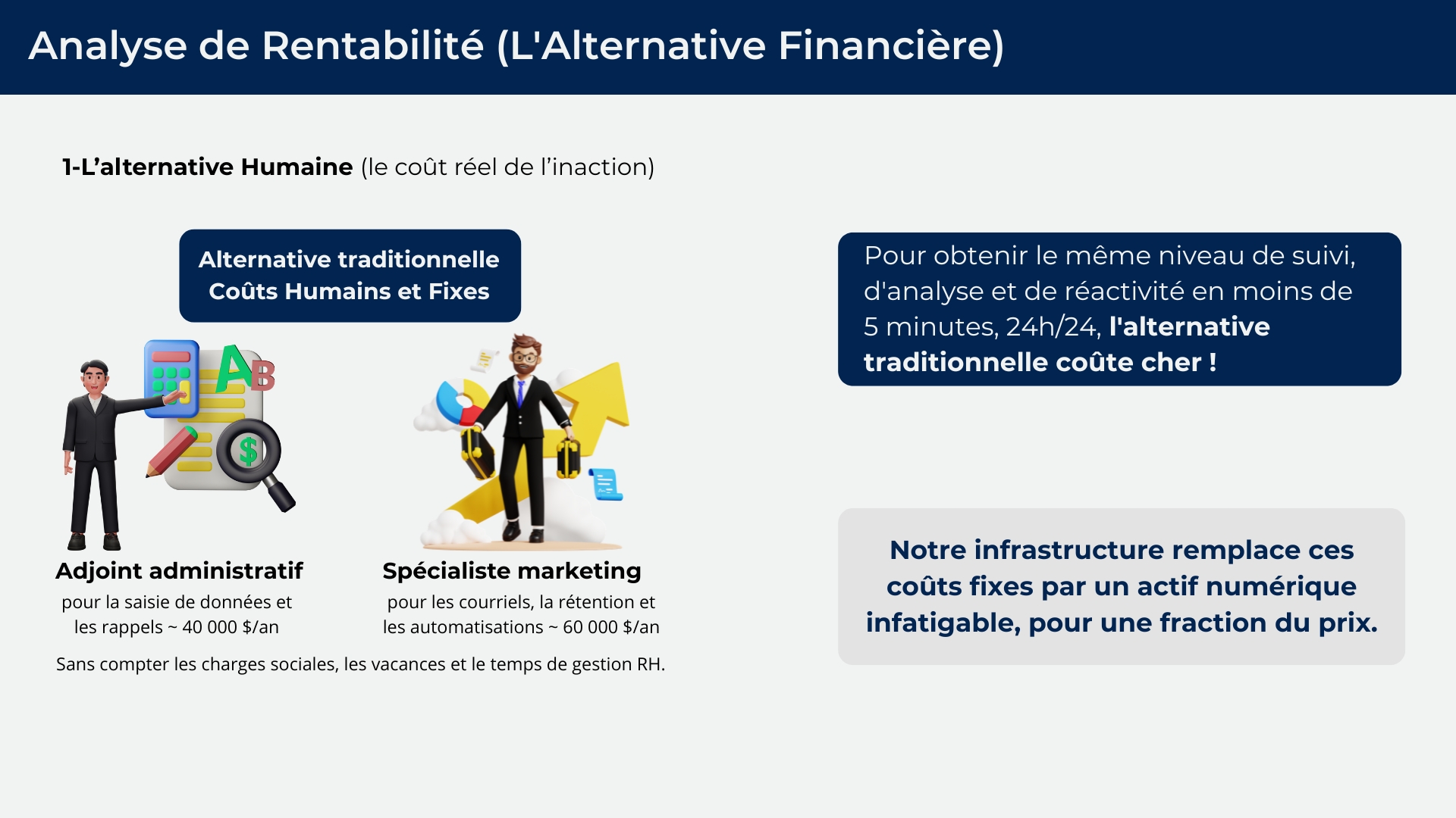 Si, après 12 mois d'utilisation complète de notre système, l'infrastructure n'a pas généré ou sauvé l'équivalent de votre investissement initial en commissions (via de nouveaux leads convertis ou la réactivation d'anciens clients), nous continuerons d'optimiser et de gérer le système pour vous gratuitement, en absorbant nos frais de Licence & Maintien, jusqu'à ce que cet objectif financier soit atteint.